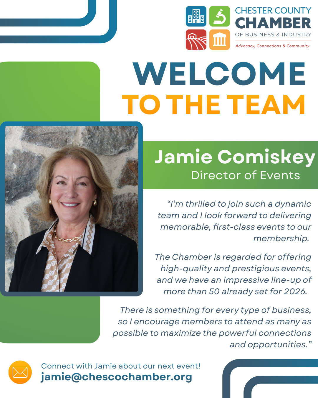 Reach out to jamie@chescochamber.org to get connected and meet her at our next event.
