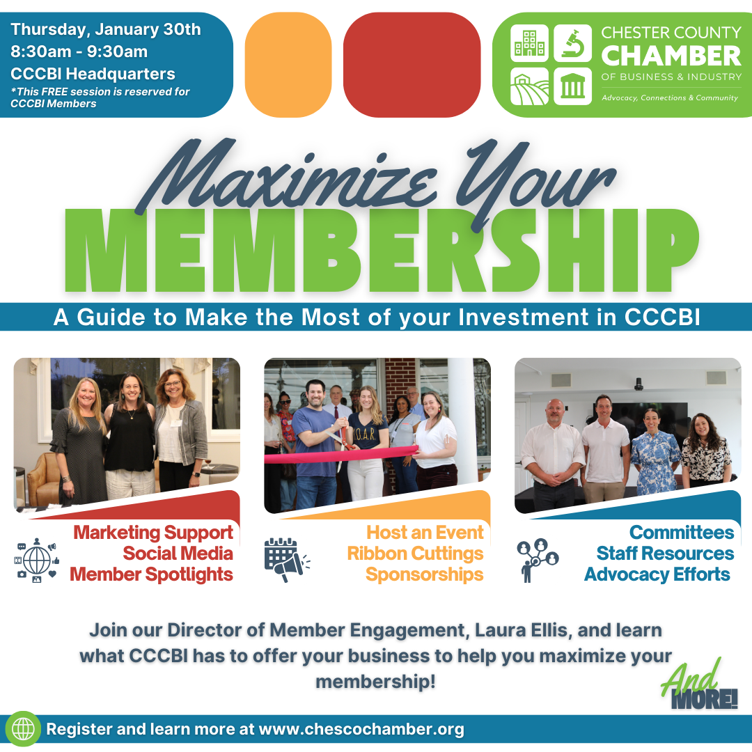 Join us for our "Maximize Your Membership" event at the Chamber! Discover how to fully leverage your membership benefits by connecting with our Director of Membership, Laura Ellis. Learn about the various committees, events, marketing opportunities, advocacy and more that can help you grow your business and expand your network. Don't miss this chance to make the most out of your Chamber membership! This is open to current and prospective members of the Chamber. REGISTRATION IS FREE FOR THIS EVENT. WE KINDLY ASK YOU TO REGISTER SO WE HAVE AN IDEA OF THE NUMBER OF ATTENDEES! THANK YOU.