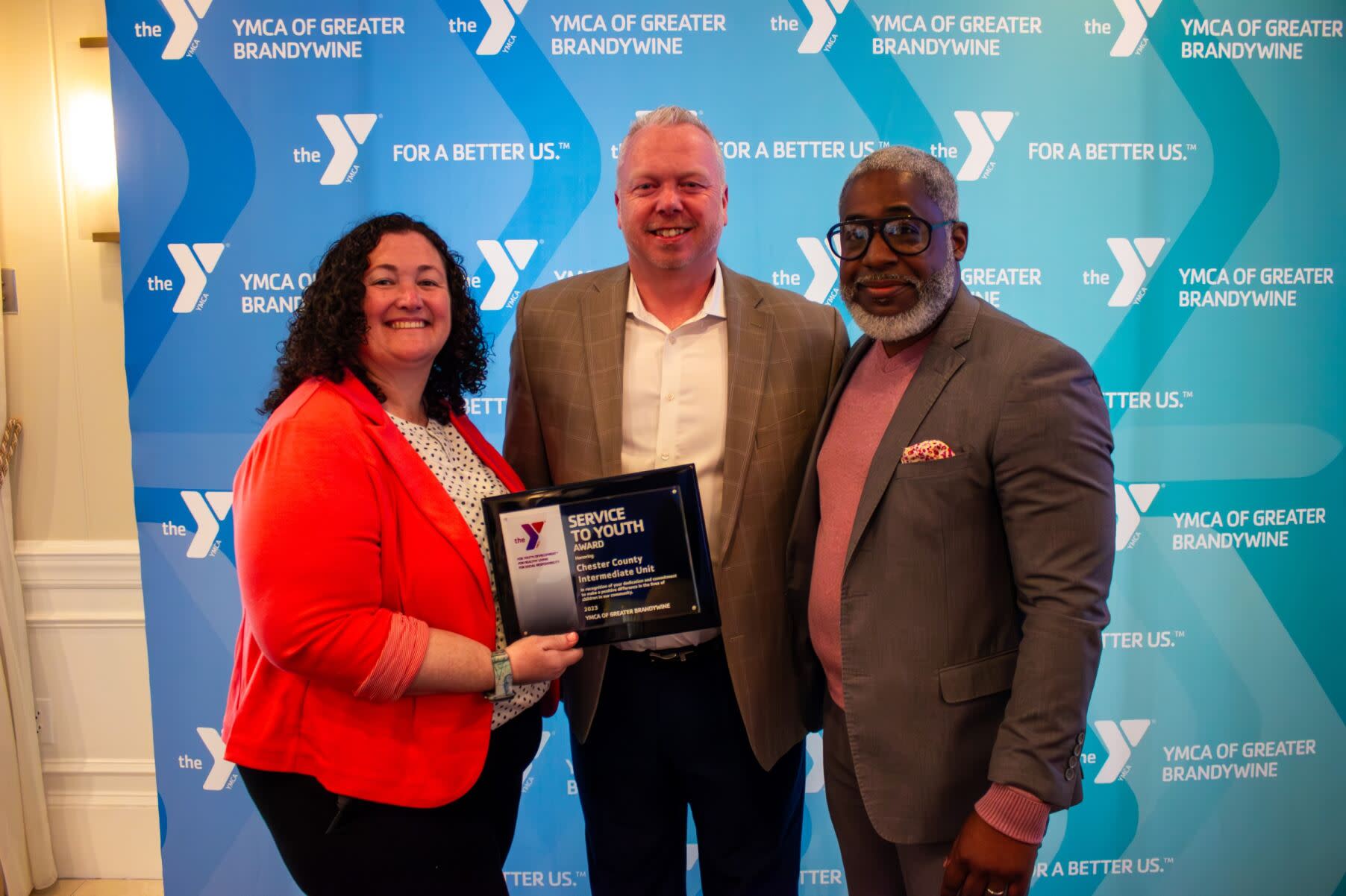 Photo Caption 2: The team from the Chester County Intermediate Unit accepts the YMCA Service to Youth Award from Bertram L. Lawson II, President and CEO of YGBW.