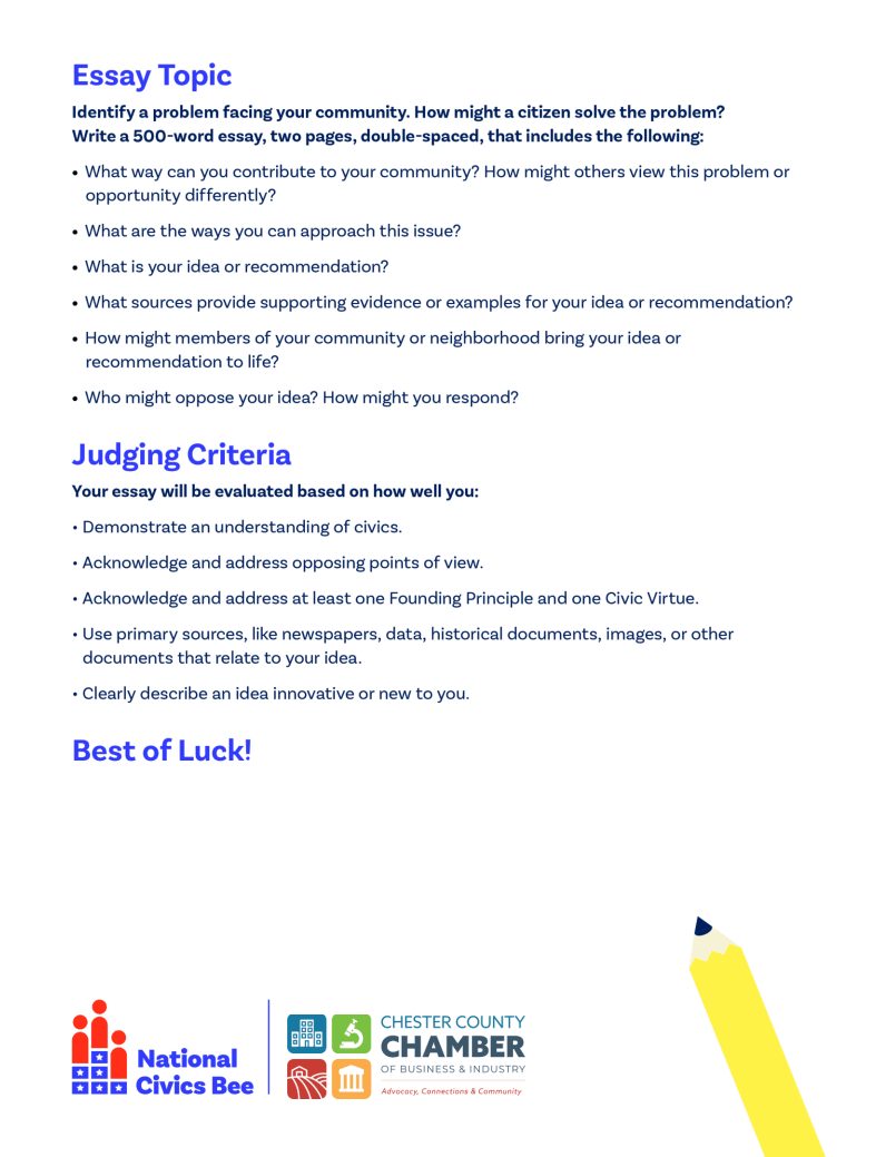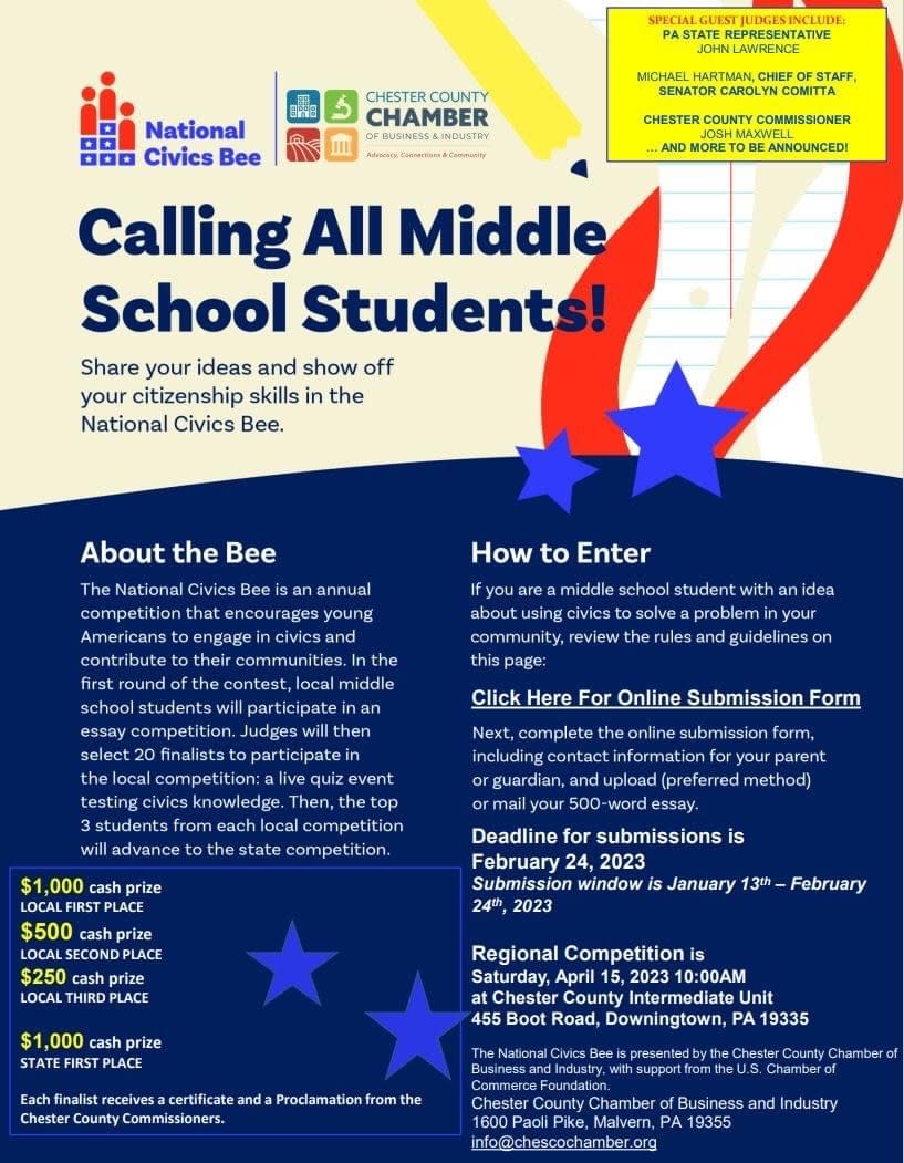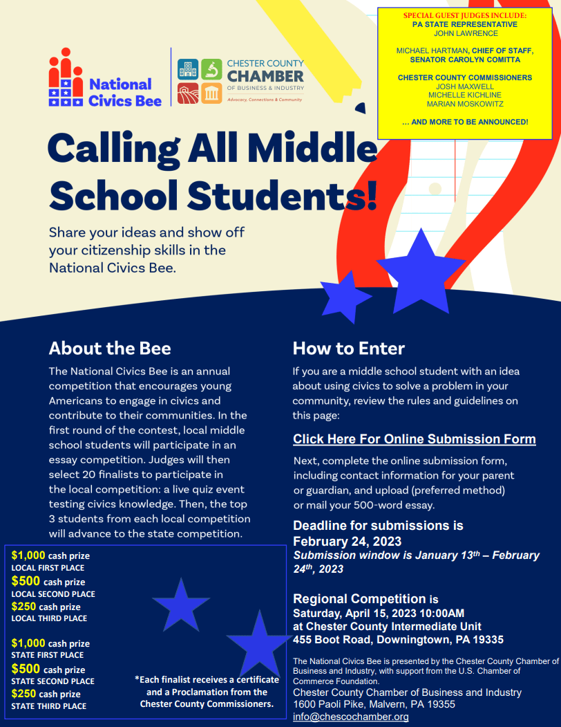 Chester County Chamber of Business and Industry is partnering with the Pennsylvania Chamber of Business and Industry and Chester County Intermediate Unit to host a regional Civics Bee, as part of the U.S. Chamber of Commerce Foundation’s National Civics Bee competition.
