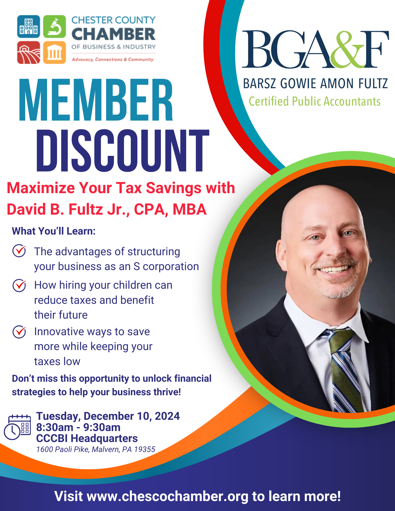 Maximize your tax savings with David B. Fultz Jr., CPA, MBA from BGA&F. Don't miss this opportunity to unlock financial strategies to help your business thrive! This is a member-only event.