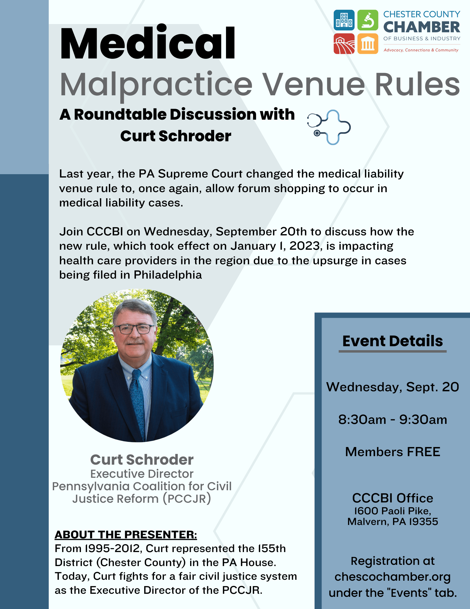 Join us on Wednesday, September 20th from 8:30 - 9:30am at the CCCBI Office to discuss how the new rule, which took effect on January1, 2023, is impacting health care providers in the region due to the upsurge in cases being filed in Philadelphia.