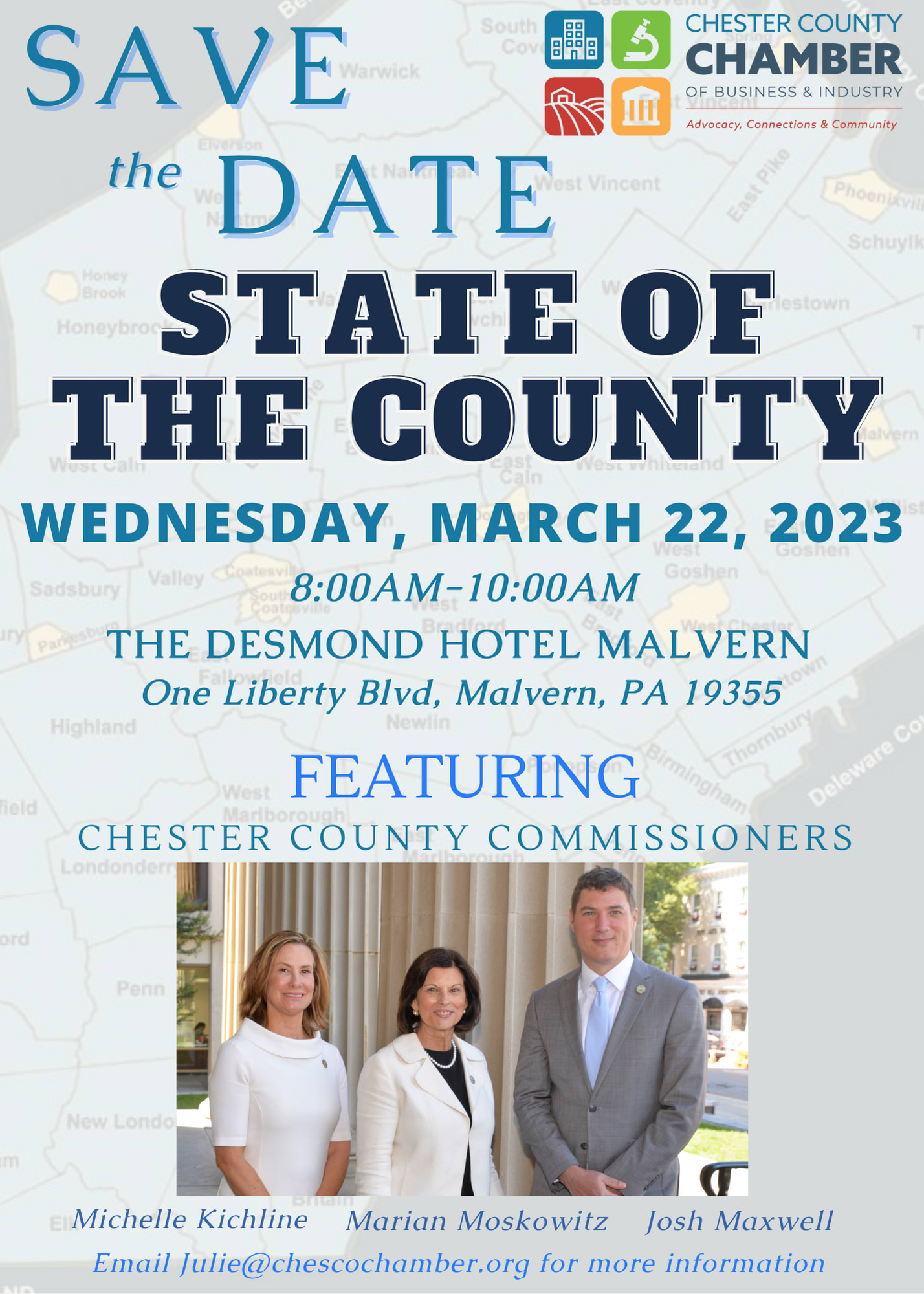 Chester County Chamber of Business and Industry will host the annual State of the County on Wednesday, March 22, 2023, 8:00AM- 10:00AM at Desmond Hotel Malvern.