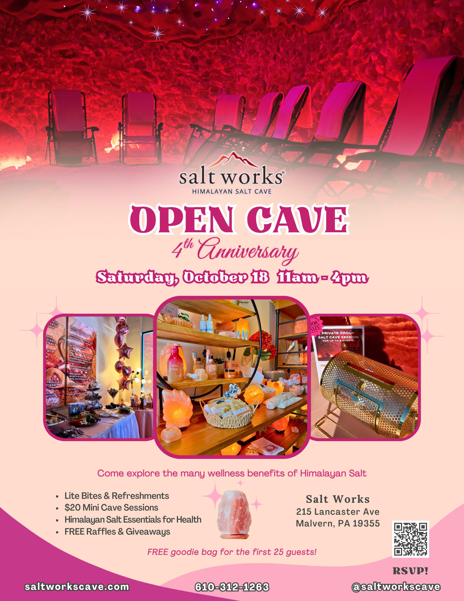 You're invited to an "Open Cave" 4 Year Anniversary Celebration at Salt Works -- the Main Line area's premier Himalayan Salt Cave! Join us for a grand celebration from 11am-4pm on Saturday, 10/18. Indulge in light bites & refreshments, conversation, raffles, giveaways, exclusive offers, interactive shopping, discounted mini cave sessions, hands-on offerings by local wellness partners including chair massages by Hand & Stone Malvern, and more; all while discovering the many wellness benefits of Himalayan salt! **We have a FREE Goodie Bag for the first 25 guests to arrive!**